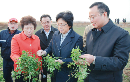 3日下午,李斌一行首先來到位于五河縣朱頂鎮(zhèn)的全國最大的紫花苜蓿生產(chǎn)基地——秋實草業(yè)有限公司調(diào)研。在市委書記周春雨、代市長白金明的陪同下,李斌深入田間察看牧草長勢,當她得知牧草品質(zhì)上乘,草場機械化作業(yè)達到世界先進水平時,不住地點頭稱贊。調(diào)研中,李斌和在這里打工的女拖拉機手、朱頂鎮(zhèn)小柳村村民劉小紅拉起家常,希望她通過自己的努力過上更加幸福美好的生活。