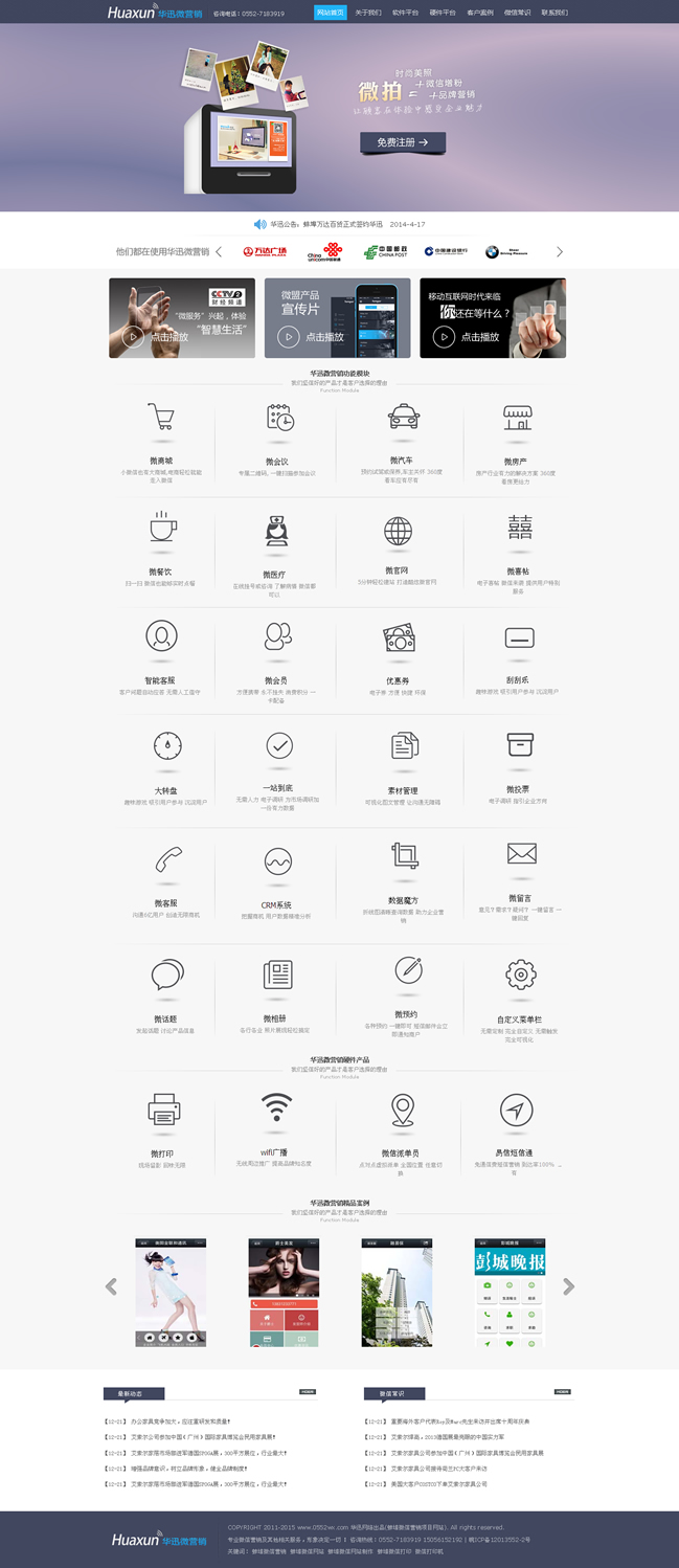 華迅網(wǎng)絡(luò)是打造一個專門針對微信公眾賬號提供營銷推廣服務(wù)的第三方平臺。主要功能是針對微信商家公眾號提供與眾不同的、有針對性的營銷推廣服務(wù)。通過華訊微網(wǎng)站平臺,用戶可以輕松管理自己的微信各類信息,對微信公眾賬號進行維護、開展智能機器人、在線發(fā)優(yōu)惠劵、抽獎、刮獎、派發(fā)會員卡、打造微官網(wǎng)、開啟微團購等多種活動,對微信營銷實現(xiàn)有效監(jiān)控,極大擴展?jié)撛诳蛻羧汉蛯崿F(xiàn)企業(yè)的運營目標。華迅微網(wǎng)站平臺很好的彌補了微信公眾平臺本身功能不足、針對性不強、交互不便利的問題,為商家公眾賬號提供更為貼心的、且是核心需求的功能和服務(wù)。在線優(yōu)惠劵、轉(zhuǎn)盤抽獎、微信會員卡等推廣服務(wù)更是讓微信成為商家推廣的利器。智能客服的可調(diào)教功能讓用戶真正從微信繁瑣的日?头ぷ髦薪饷摮鰜,真正成為商家便利的新營銷渠道。